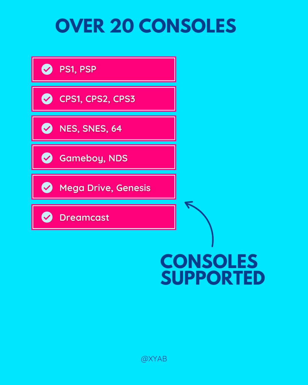 Supports 8-bit, 16-bit, arcade, and handheld titles from all major retro libraries.